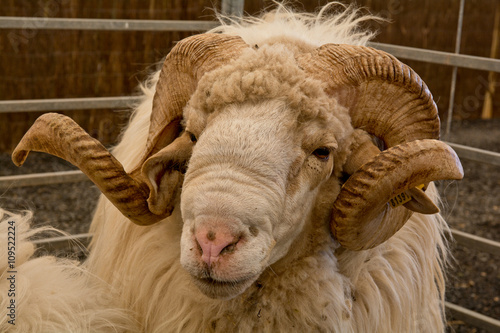 Halbprofil eines Schafbocks mit langem Haar und geschwungenen Hörnern.
