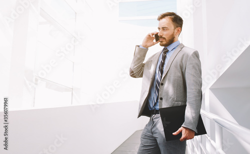 Half length portrait of rich businessman holding portable digital tablet during work break in hallway