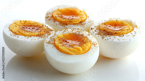 Half-boiled eggs on a white background showing their yolks. created with Generative AI technology