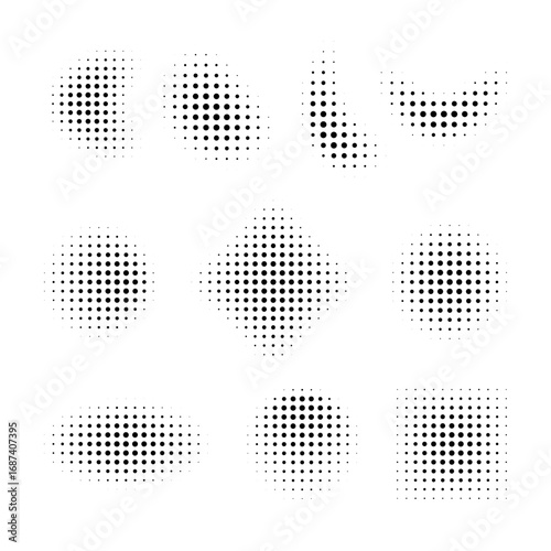 Halftone gradient shapes set. Abstract dotted circles, squares, and geometric elements for modern design and decoration.