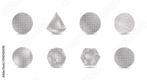 Halftone shapes with gradient effects in various forms and sizes on white background