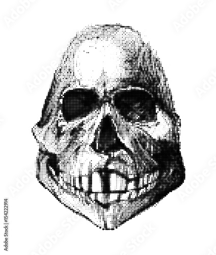 Halftone skull. Design element. Invitation, party. Mosaic, perforation, grunge.