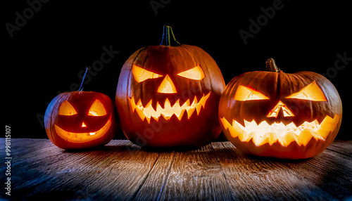 Halloween background, pumpkins for halloween with scary faces glowing on black night, scary pumpkins