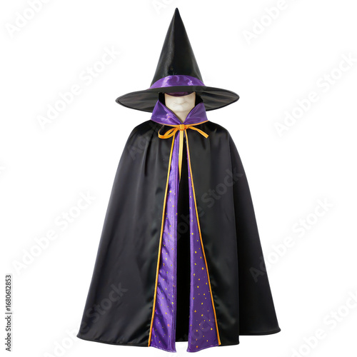 halloween costume ideas A witch costume with a pointed hat and flowing cape in black and purple.
