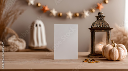 Halloween decoration, white card mockup, autumnal table setting, spooky ghost and pumpkin