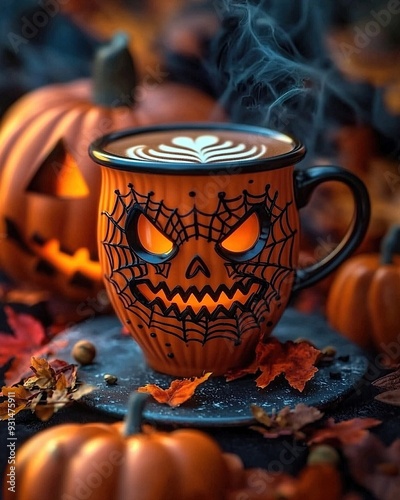 Halloween decoration with coffee cup and autumn theme. Generative Ai