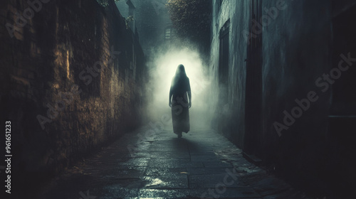 Halloween Ghost Floating Through Foggy Alley at Midnight