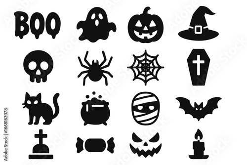 Halloween icons set: ghost, pumpkin, skull, spider, witch hat, bat, cat, mummy, tombstone