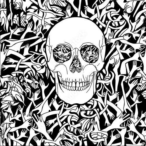 halloween monochrome card doodle background with human skull and hands