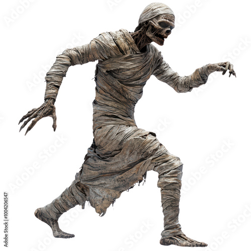 Halloween mummy walking isolated on white transparent. Mummified egyptian scary creature