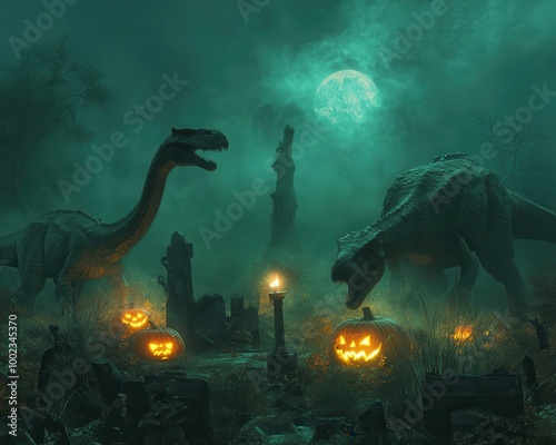 Halloween Night with Dinosaurs Pumpkins and Full Moon