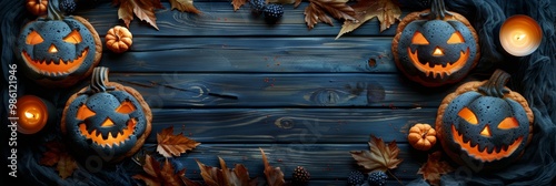 Halloween pumpkin cookies with spooky faces on black table, ideal for mockup needs