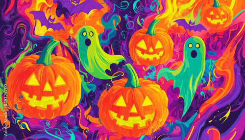 Halloween Pumpkins and Ghosts on a Vibrant, Swirling Background
