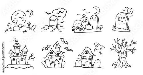 Halloween themed graveyard, haunted house, and spooky tree doodle illustration set