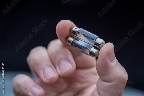 Halogen car new and old lamp bulb. Male hand holding car parts