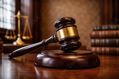 Hammer and wooden base detailed in a polished legal area with textured backdrop