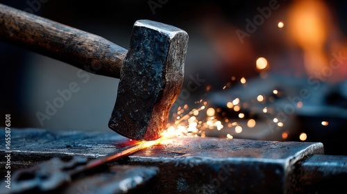 Hammer strikes hot metal on an anvil, sparks fly upward in a dark workshop. Use to portray blacksmithing, industry, manual labor, and metalwork.