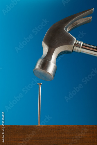 Hammering nail into wooden surface against blue background.