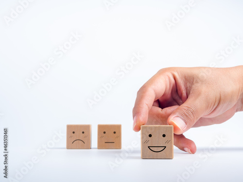Hand choose smile face on wooden cube block on white background with copy space. Customer feedback and review rating. Client choice. Customer service evaluation and satisfaction survey concepts.