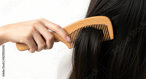 Hand Combing Long Black Hair with a Wooden Comb