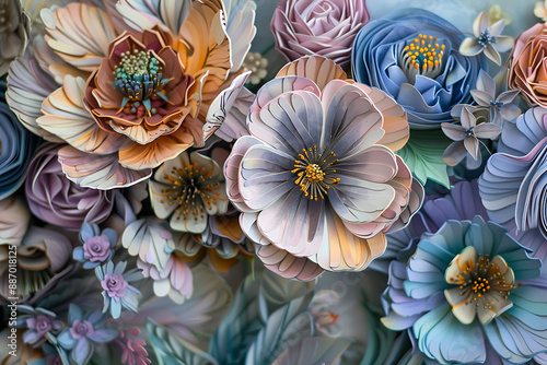 hand crafted variety colourful cardboard paper roses flowers on large green textured background