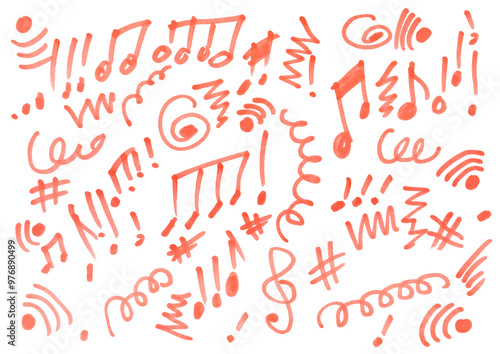 Hand draw musical notes, doodle red felt tip pen sketching isolated on white
