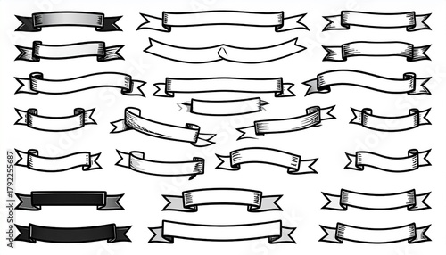 Hand drawn black ribbon banners icon set . Design elements for greeting cards, banner