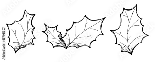 Hand drawn Christmas and New Year holly leaves bunch with berries. Vector illustration. Christmas decoration isolated on a white background. For invitations, greeting cards, print, web, design, decor.