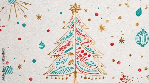 Hand drawn christmas tree sporting gold, red, teal ornaments and stars, creating festive mood on textured paper with playful holiday charm