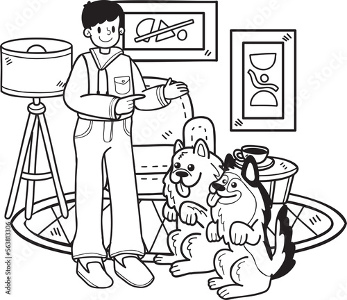 Hand Drawn dog is being trained by owner illustration in doodle style