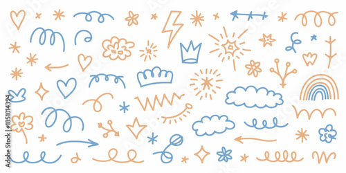 Hand drawn doodle elements in blue and orange on white background for graphic design