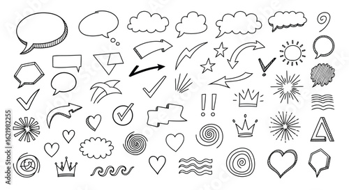Hand drawn doodle elements speech bubbles arrows hearts stars sun crowns waves and symbols sketch illustration