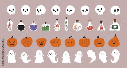 Hand drawn Halloween clipart set with ghosts, pumpkins, skulls, and potions. Perfect for spooky cute designs, stickers, prints, and seasonal illustrations.
