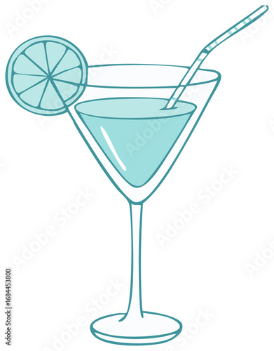 Hand drawn illustration of a blue cocktail in a martini glass with a lime garnish and straw