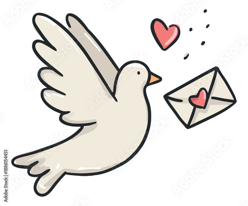 Hand drawn illustration of a dove depicting flying with a love letter for romantic messages