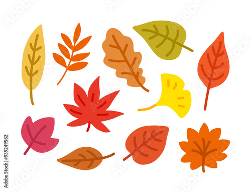 Hand drawn illustration of fallen leaves from trees in fall season. Ginkgo leaves, maple leaves.