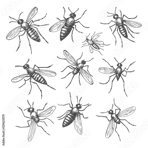 Hand Drawn Illustration Of Nine Mosquitoes In Various Poses