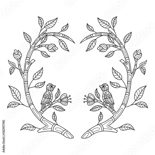 Hand drawn of bird with leaf frame in zentangle style