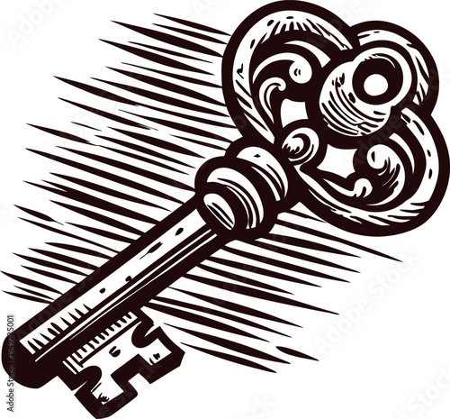 Hand drawn ornate vintage skeleton key illustration with intricate engraving in retro antique engraving