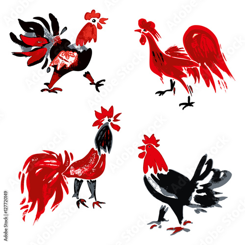 Hand drawn Roosters 2017. Set of vector bird cock. Speckled doodle cocks.