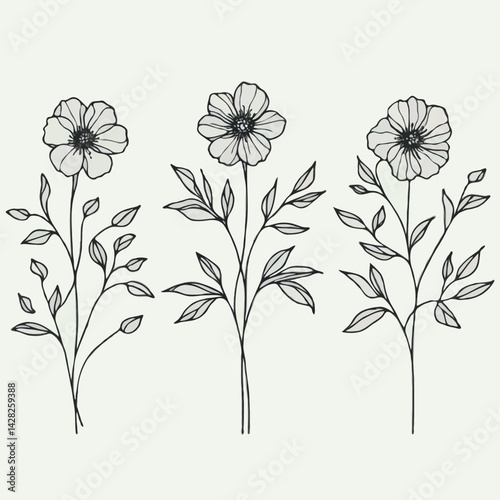 Hand drawn wild flowers Botanical drawing. line art grasses, stems illustration. Black and White Meadow herbs. Herbaceous blooming plants. Set of outline doodle floral sketch poppies, hellebore