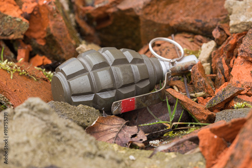 Hand grenade lying on a brick wall.