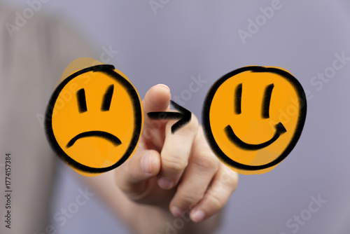 Hand guiding a digital sad face to a happy face, symbolizing emotional transformation, mental health improvement, and a positive shift in mood a