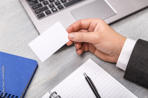 Hand hold blank business card design mockup. Businessman holding visiting card. Business branding template. Person in suit and white shirt.