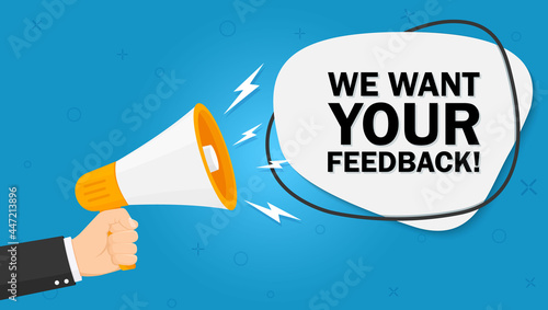 Hand hold megaphone. We want your feedback in bubble. Vector illustrationon on blue background. Flat design