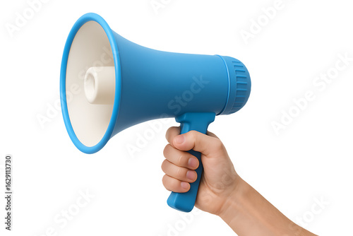 Hand holding a blue megaphone isolated on transparent background
