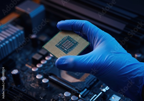 Hand holding a computer processor on a motherboard with blue gloves