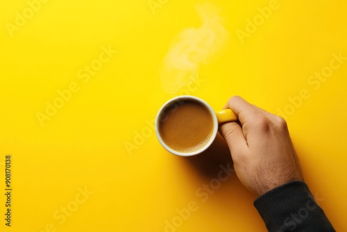Hand Holding a Cup of Steaming Coffee on Yellow Background