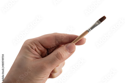 hand holding a flat paintbrush ready to create an artwork . Isolated on transparent background, png