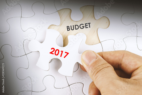 Hand holding a jigsaw puzzle with word BUDGET 2017.